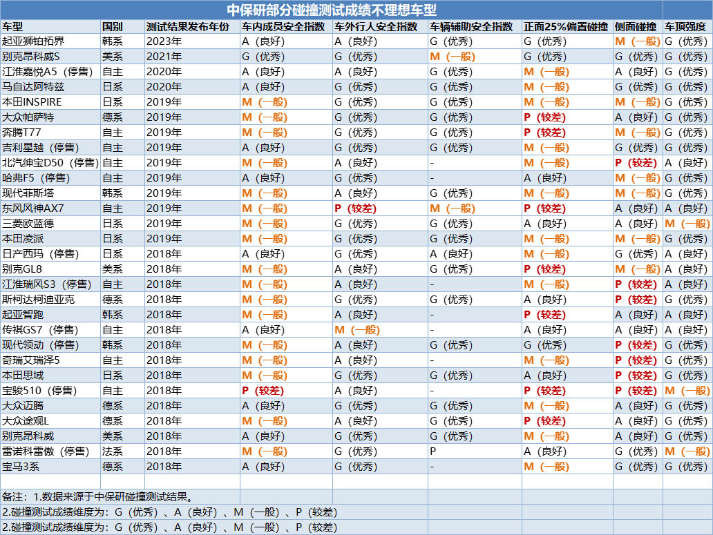 ▲侧面碰撞获p(较差)的部分车型从上到下依次为